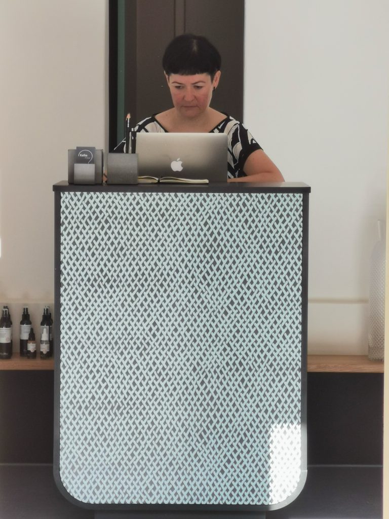 Und nebenan? Da sind noch die Fliesen von V&B auf dem Boden, das Lino in Blaugrau liegt auch in der Empore. Felix strahlt und schraubt weiter… Katha berät die nächste Kundin zur Frisur. und