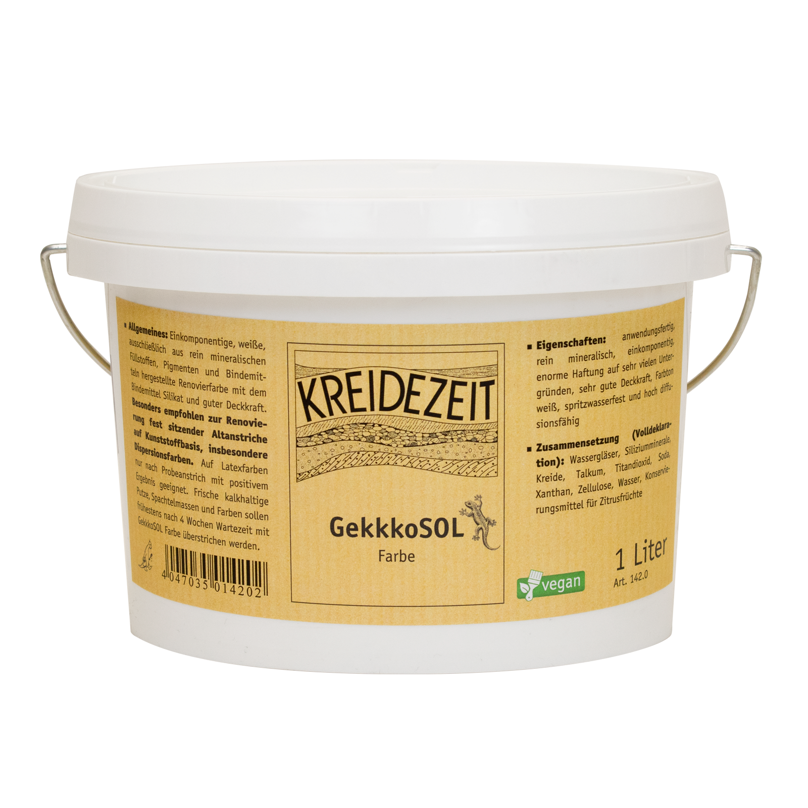 GekkkoSOL Farbe basiert auf einer Mischung aus Wassergläsern. Eine besondere Zusammensetzung und Kombination dieser Wassergläser erzeugt ein für reine Mineralfarbe enorm breites Anwendungsspektrum.